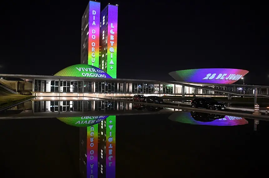 O Congresso Nacional se iluminou na noite desta sexta-feira (28) com a projeção em celebração ao Dia Internacional do Orgulho LGBTQIA+. A projeção nas cúpulas do Senado Federal e da Câmara dos Deputados e nas laterais dos edifícios dos anexos I de ambas as Casas Legislativas, apresentou as cores-símbolo da comunidade LGBTQIA+ e os dizeres:28 de junho — Dia do Orgulho LGBTQIA+: falar com orgulho, amar com orgulho, existir com orgulho, viver com orgulho.