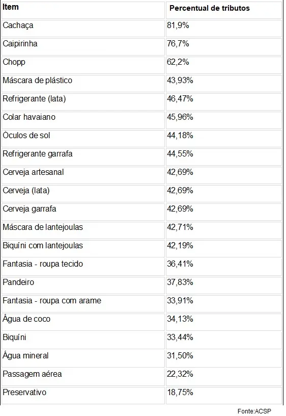 Dessa forma, confira na tabela o percentual de tributos embutidos nos preços de itens típicos de carnaval: