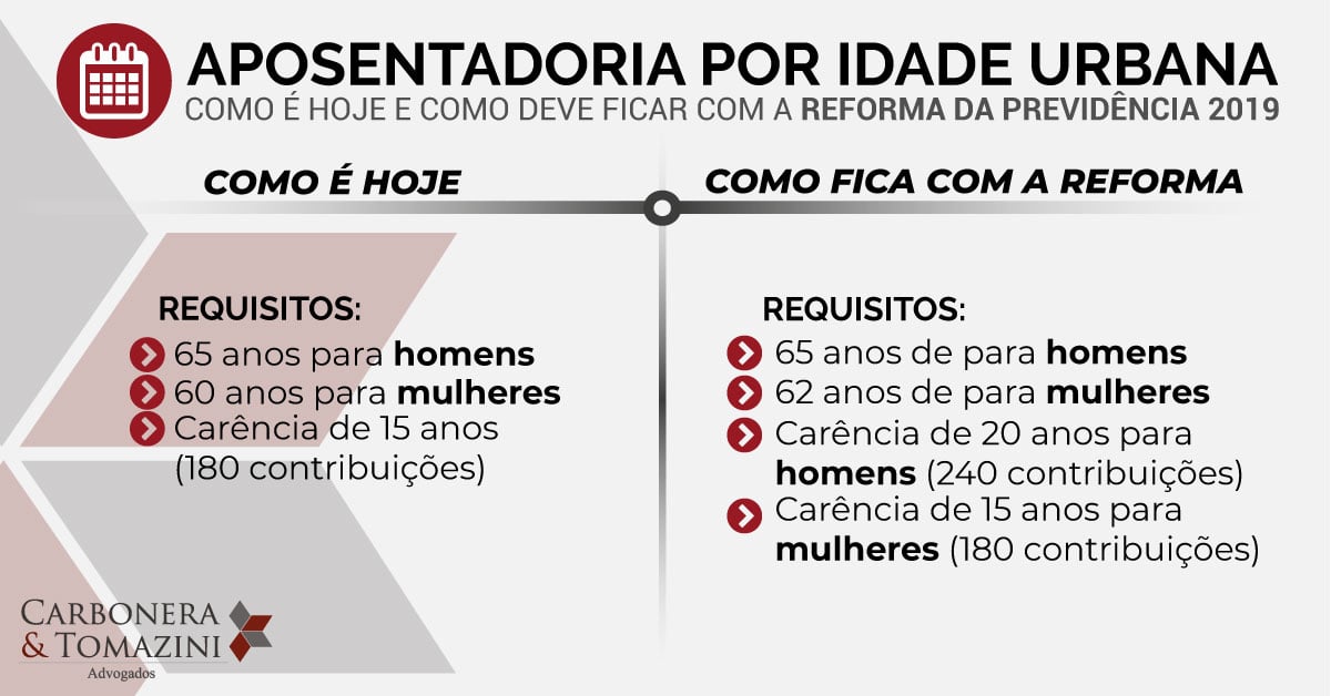 Com a Reforma da Previdência 2019, para garantir o direito à aposentadoria por idade, haverá algumas mudanças. A idade mínima exigida para o homem permanece a mesma, ou seja, 65 anos. Já no caso da mulher, serão exigidos 62 anos.