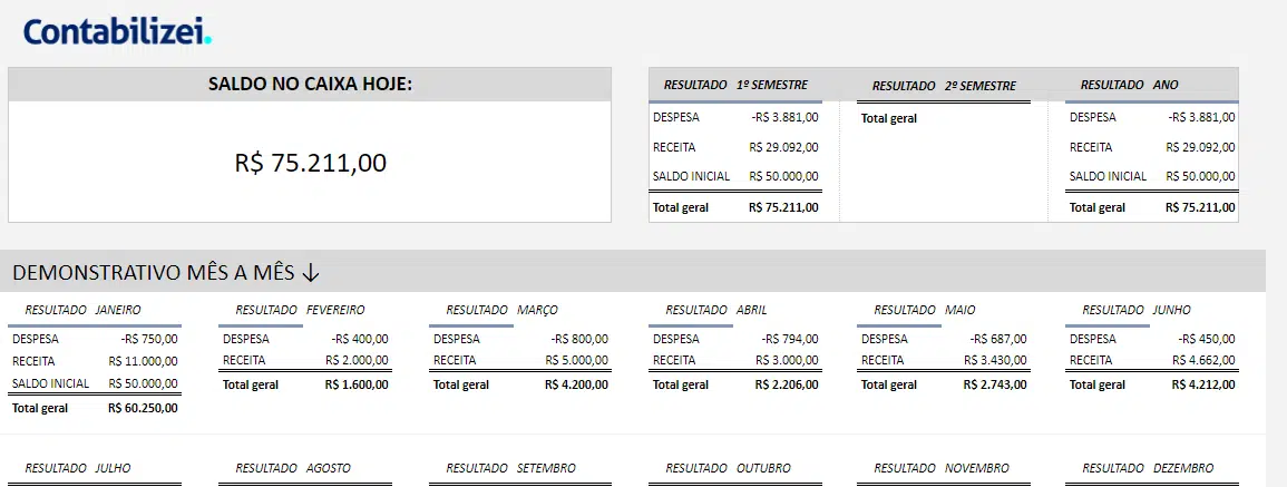 O modelo de planilha grátis também serve como uma ferramenta consultiva, que lhe permite acompanhar não só as transações do dia a dia, mas as receitas e despesas ao longo dos meses, do semestre e do ano.