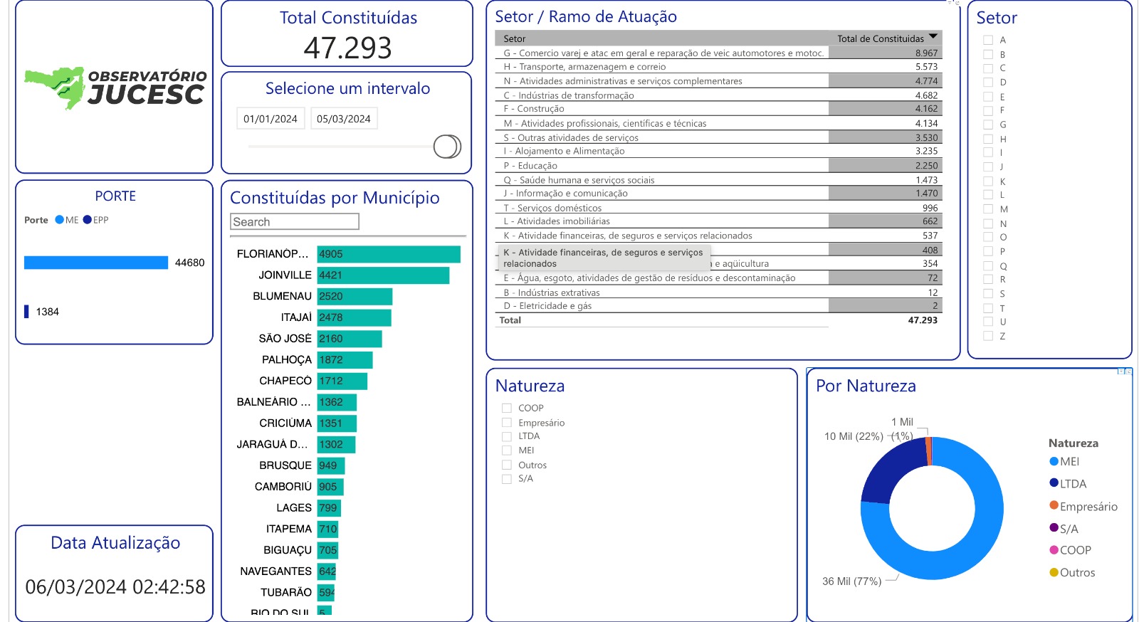 De janeiro até o dia 5 de março deste ano, já foram abertas 47.293 empresas em Santa Catarina, sendo que 36 mil são MEI, representando 77% do total. Os dados são do Observatório da Junta Comercial do Estado (Jucesc), vinculado à Secretaria de Estado de Indústria, Comércio e Serviço (Sicos).