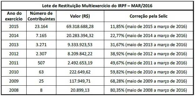 Receita abre na terça-feira (8/3) a consulta ao lote de restituição multiexercício residual do IRPF do mês de MAR/2016. Valores serão depositados na conta dos contribuintes...